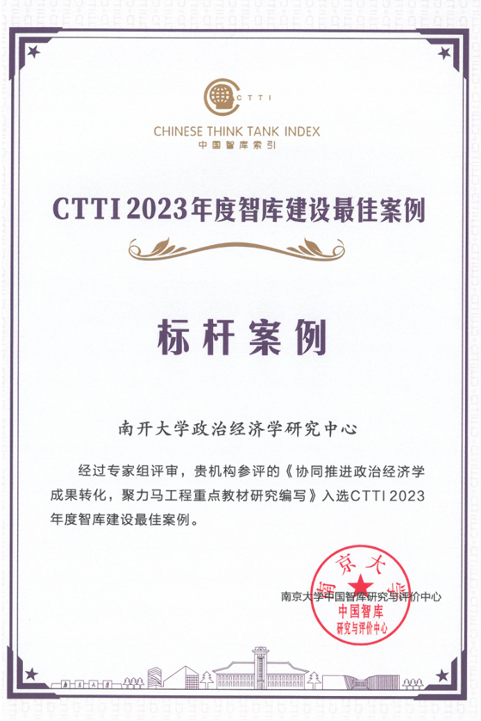 日前,由南京大学等单位共同主办,南京大学中国智库研究与评价中心承办的“2023新型智库治理论坛”成功召开。南开大学政治经济学研究中心完成的《协同推进政治经济学成果转化,聚力马工程重点教材研究编写》获评为中国智库索引(简称CTTI)2023年度智库建设标杆案例。