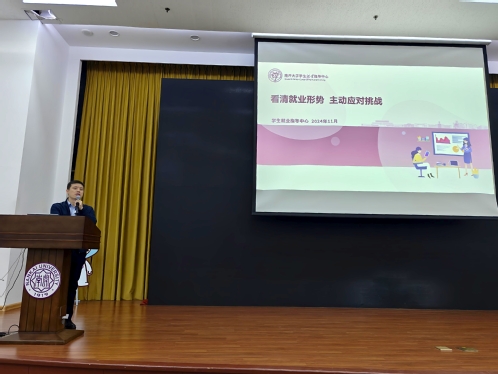 讲座伊始,王友江结合自身丰富的就业工作经验,从供需关系、就业结构、就业心态三个方面深刻剖析了当下就业形势。通过分享近些年南开大学毕业生的毕业去向数据,他强调在大学期间做好生涯规划的重要性和必要性,希望同学们尽早明确个人发展目标,认真思考未来的职业发展方向,更好地规划大学学习生活。