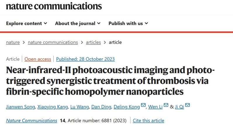 Recently, the latest research findings in the realm of photo-triggered synergistic treatment of thrombotic diseases, conducted by Ji Qi, Deling Kong et al. from the State Key Laboratory of Medicinal Chemical Biology and the College of Life Sciences at Nankai University, were published in Nature Communications, a world-renowned journal, with the title “Near-infrared-II photoacoustic imaging and photo-triggered synergistic treatment of thrombosis via fibrin-specific homopolymer nanoparticles”. The team designed and developed a novel organic molecular probe with remarkable thrombus-targeting capabilities. This innovation not only enabled the high-resolution visualization with long-wavelength second near-infrared (NIR-II) photoacoustic imaging in vivo but also facilitated the synergistic treatment of thrombosis through thermophoresis and controlled release of nitric oxide.
