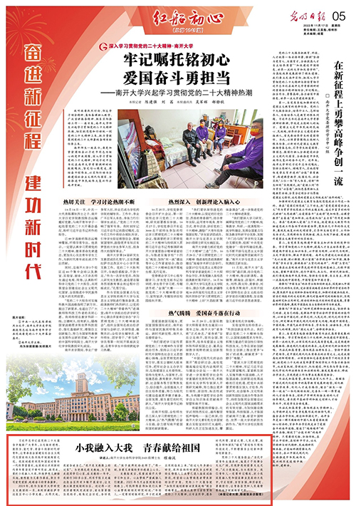 支教结束后,我重返南开大学学习和生活。心血管病严重威胁人们健康。2021年冬天去医院做实验的路上,司机师傅在得知我们从事心血管疾病相关研究时说:“年轻人,一定要好好做研究,早日把成果应用到临床上来。”经过七年多潜心研究,我所在的科研团队自主研发的生物型人工血管已进入临床试验阶段,有望给心血管病患者带来新的治疗方案。党的二十大报告就“加快实施创新驱动发展战略”提出明确要求。我要认真学习宣传贯彻党的二十大精神,以专业所学,服务时代所需、国家之需、人民之需,跟随导师和团队“锚定”原创性引领性科技攻关,不断增强自主创新和原始创新能力。